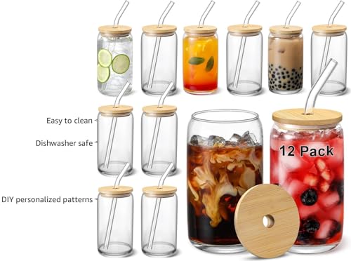 VITEVER 2 Pack Glass Cups with Bamboo Lids and Glass Straw - Beer Can Shaped 16 oz Iced Coffee Drinking Glasses Cute Tumbler Cup for Smoothie Boba Tea Whiskey Water Price in USA