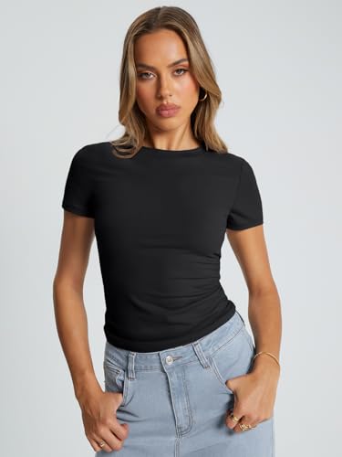 SAMPEEL Womens Summer Tops Ruched Cap Short Sleeve Shirts Round Neck T Shirts Fashion 2025