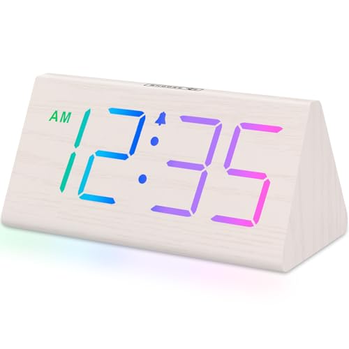 Wooden alarm clock with 1.8 in large big digits time is easy to see without glasses which is vision friendly for seniors and the elderly. Time display is 12HR and 24HR switchable. RGB Dynamic Display with Dimmable Brightness come with 8 patterns color changing display the modern bedroom clock provides multiple color choices that can be freezed making a pretty alarm clocks for kids boys girls teens and daughter. Display brightness is 5 levels + OFF adjustable. Modern clock simple to operate setting the clock time only needs 2 steps perfect for kids youth teen adults and parents. Battery backup alarm clock for power cut time will not display but the alarm will goes off on the set time with just battery power. 5 level dimmable alarm clock plus an OFF option so you can adjust the brightness per your need so it won't disturb your sleep. Alarm clock with USB Charger allows you to charge your cellphone w