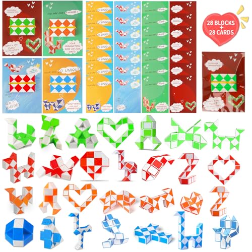 Our valentines day cards for kids school Includes 28 fidget toys wacky tracks and 28 Valentine's Day cards making it ideal for classrooms Valentine's exchanges and party favors. Each toy can be packaged as valentines day gifts for kids for easy distribution and giving away. Our valentines cards for kids school has a special greeting words in each valentines day cards the Fidget Toys can turn it into Various shapes:Numbers Letters heart snake etc.or other imaginative shape by rotating the Fidget Toys Thiese Fidget Toys Can bring challenges and fun to your fingers and brain. These Sensory Toys can improve concentration and focus while lowering tension and anxiety. These Valentines Day Cards and Fidget Toys Give Everyone Greeting and FUN!Tt is the Best Valentines Gifts for Kids Suitable for Boys and Girls.Perfect for Valentine's Party Favors Valentines Classroom Prize Supplies Valentines treats Valentine's giveaways Class reward or any Valentine’s event. Ideal Gift Choice for Kid