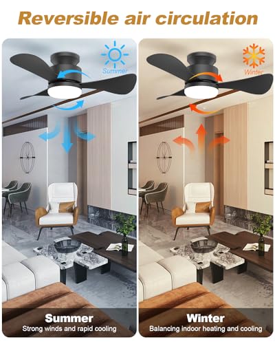 BYKISTOK Flush Mount Ceiling Fans with Lights - 46"" Black Low Profile Ceiling Fan Light with Remote/APP 6 Speeds Mute Reversible Motor Modern Ceiling Fans for Indoor and Outdoor Bedroom Patios