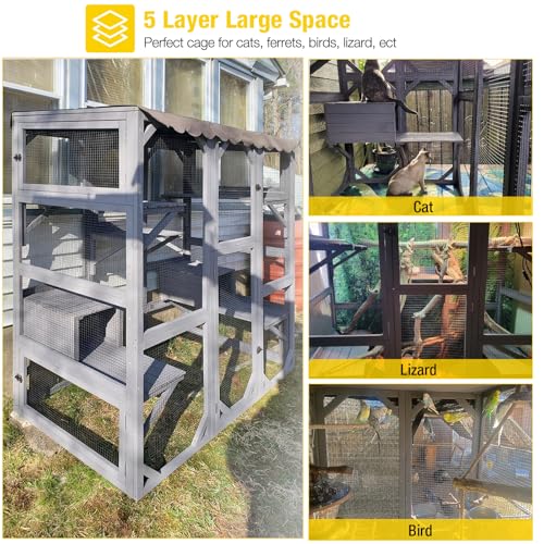 Aivituvin Large Cat Catio 4 Tiers Cat Enclosures House for Outdoor Indoor Cats with Weatherproof Roof 3 Resting Rooms 3 Platforms 5 Windows 70"" H 77"" L