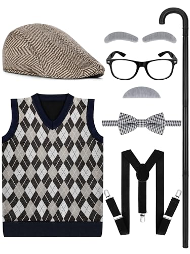 Celebrate the 100th day of school for children with old man costumes. Suitable for school events ensure your child stands out during school celebrations. Package Including: 1 x Newspaper hat 1 x Glasses 1 x Bow tie 1 x Knitted vest 1 x Suspenders 1 x Canes a set of eyebrows and mustaches Product Size: Newspaper hat: 19.6\" Glasses: 5.7\" Bow tie: 3.9\" Suspenders: 23.6\" Canes: 35\" Age Range: 3-4 years Color: Black grey Feature: The vest comes in various colors and sizes made of high-quality materials making it more comfortable and breathable to wear Hats glasses and ties can be reused durable and not easily damaged The suspenders have elasticity and the canes can be pieced together and installed according to the size you need