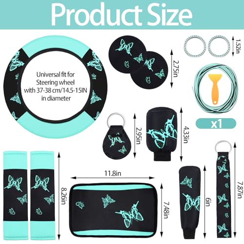 BBTO 43 Pcs Butterfly Car Seat Full Set Butterfly Car Accessories for Women 5 Front Rear Seat Covers Wrist Strap 2 Pcs Cup Mat Armrest Pad 2 Seat Belt Cover Accessories for SUV Car(Mint Green Black) Price in USA