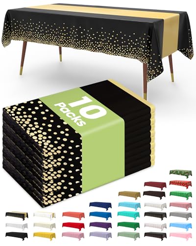 Specifications & Details: The Pureegg Plastic Table Cloth Disposable 10 Packs 54"x108" is made of high-quality PEVA material, ensuring it is both waterproof and stain-resistant. The table cloth measures 54" x 108", making it suitable for tables up to 8 feet long. It is also compatible with various kinds of tables, including folding buffets, outdoor picnic, kitchen, and dining tables. The decorative black table cloth with a printed gold table runner is an excellent choice for adding a touch of elegance to your events.