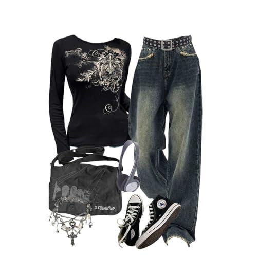 EMMIOL Baggy Jeans Y2k Women Streetwear Jeans Vintage Wide Leg Straight Denim Pants Womens Casual Trousers Dark Grey Price in USA