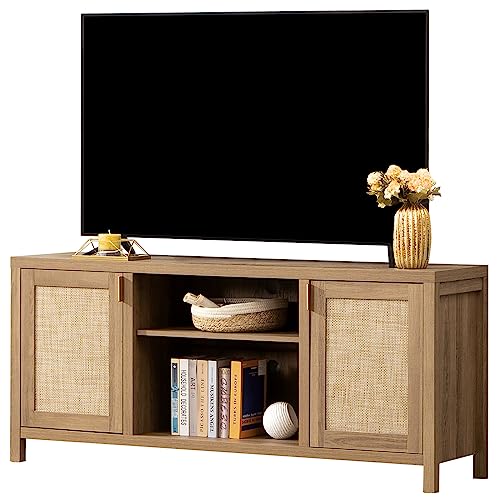 SICOTAS Rattan Dresser for Bedroom 56.9"" Wide 6 Drawer Dresser with Ample Storage Wooden Dressers Large Chest of Drawers for Nursery Closet Boho TV Stand for Bedroom (Light Oak 1 Piece)