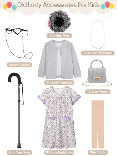 FancyFun 8 Pieces Old Lady Costume for Girls 100 Days of School Costume for Kids Grandma Wig Granny Dress Cosplay Outifits Set F 11-13Y