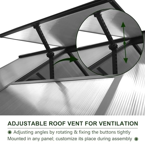 Yardenaler 6x10 FT wooden greenhouse is designed with adjustable roof vent which can provide UV protection temperature balance and air ventilation. The maximum opening angle is 45 degree you can adjust it to the position you need. Our outdoor greenhouse is also designed with lockable door to keep safe. We use upgraded polycarbonate panel for high light transmission and UV protection. The frame of our greenhouse is made of high quality material which is weather proof it can be used not only on sunny days but also on rainy and snowy days. The space of our walk in greenhouse is large enough for grow plants store equipment and relaxing