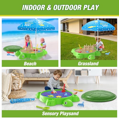 The HYES Turtle Sandbox (38.1"" x 25.5"" x 7.4"") is perfect for group play offering endless fun for kids and families indoors or outdoors! Designed to boost fine motor skills spark creativity and encourage sensory exploration it includes an adjustable beach umbrella (max size: 39.3"") and 8 beach toy accessories for sand play. Made from non-toxic kid-safe plastic with smooth edges it’s durable easy to clean and features a removable turtle-shell lid for convenient storage and a charming look. Perfect for toddler boys and girls ages 3-5 this sandbox is an ideal summer gift and a hit for holidays like Easter birthdays Thanksgiving and Christmas with easy setup instructions included!