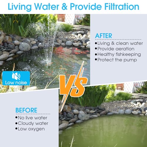 POPOSAOP Pond Filters for Outdoor Ponds Koi Pond Filter Box with 660GPH 40W Pond Pump & 9 RGB Multi-color LED Lights for Outdoor Ponds Pond Fountain Kit for Garden Water Tank Waterfall. Key Features: 1. pond filters for outdoor ponds. The pond pump and filter kit is a fully integrated unit that is positioned in the pond and guarantees beautiful clear and healthy water and an attractive and reliable fountain and waterfall display; 2. Keeping your pond beautiful,clean and healthy; 3. Suitable for ponds of up to 2500 litres; 4. Easy to install tool free maintenance; 5. Safety clip open/close cover is more convenient; 6. Slot to put the electric cord Specification: Pond Pump Power: 40W/110V Flow Rate: 660GPH (2500L/H) Cord Length: 10ft Packaged consists 1* Filter Box 1* Water Pump with US Plug 1* Fountain Nozzles & Hose Kit 1* Water Pipe 9* RGB Multi-color L