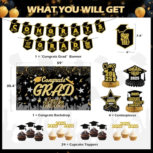 Elevate your 2025 graduation party with our complete blue and sliver graduation party decorations pack – designed to turn any space into a celebration hub! We get it – planning a grad party is stressful enough. That's why every piece is color-coordinated and ready to use. No mismatched decor no last-minute store runs. Just unbox decorate and watch your grad’s face light up when they see their worthy celebration! Why Choose It: Instantly creates a cohesive ""2025 graduation party decorations"" theme Reusable elements (graduation backdrop graduation banners) for future milestones Make guests feel ""Wow they thought of EVERY detail!"" Budget-friendly alternative to expensive event planners Elevate your 2025 graduation party with our complete blue and sliver graduation party decorations kit – designed to turn any space into a celebration hub!