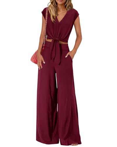 PRETTYGARDEN Women's Summer 2 Piece Outfits 2025 Cap Sleeve V Neck Belted Crop Tops Wide Leg Pant Sets Casual Tracksuit(Solid Dark Wine Red Large) Price in USA