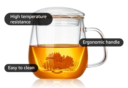 This elegant glass tea cup with infuser and lid is made from high-quality extra-thick borosilicate glass. Perfect for loose leaf or blooming tea it is microwave and stovetop safe. Its ergonomic handle ensures comfort while the clear design lets you enjoy the brewing process. A thoughtful Christmas or birthday gift for women and tea lovers.