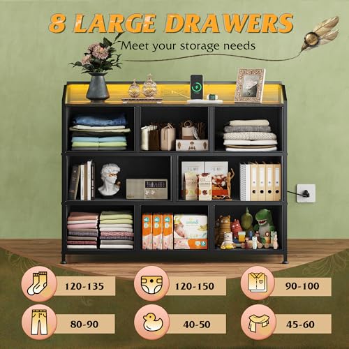WLIVE 9 Drawer Led Dresser for Bedroom 58.35'' Black Wood Dresser Storage Organizer with Power Outlets for 65'' TV Dressers with Open Shelves Chest of Drawers for Closet Living Room
