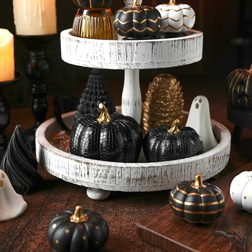 FESTGLOX 2Pcs Light Up Black Pumpkins for Halloween with Gold Lines Small Jack O Lantern Pumpkins with Purple LED Light Resin Halloween Pumpkin for Indoor Spooky Decor Table (Battery Operated)