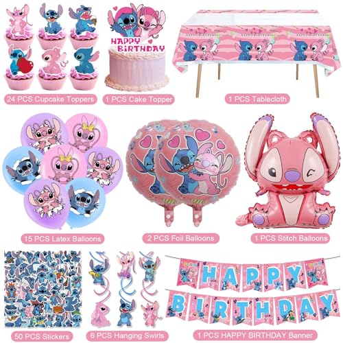 Stitch Party Supplies 103PCS Birthday Decorations Set Include Banner Balloons Stickers Hanging Swirls Cake Cupcake Toppers Tablecloth for Boys Girls Stitch Theme Party