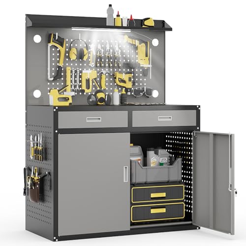 65"" Heavy Duty Workbench with Drawers and Lockable Storage Cabinet- 2000 LBS Capacity Work Bench with Pegboard Organiser Work Table with Adjustable LED Light for Garage Workshop and Repair Shop Price in USA