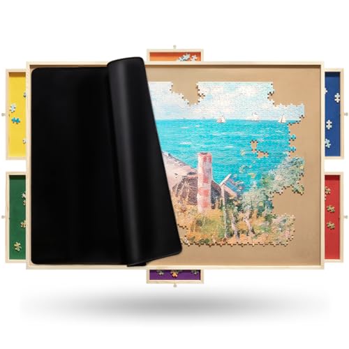 Rnice 1500 Piece Rotating Puzzle Board Pro 35"" x 26"" with Drawers Rubber Cover Mat 360° Lasy Susan Sort-Wise Colorful Felt Drawers & 4 Trays Wooden Jigsaw Puzzle Table Birthday Gifts for Mom