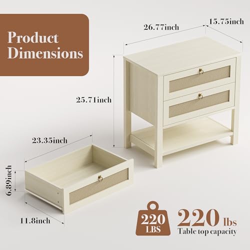 GRUSIGN Nightstand with Drawers and Storage Shelf - Large Nightstands Rattan Decor Boho Bedside Table Narrow Side Table for Bedroom White