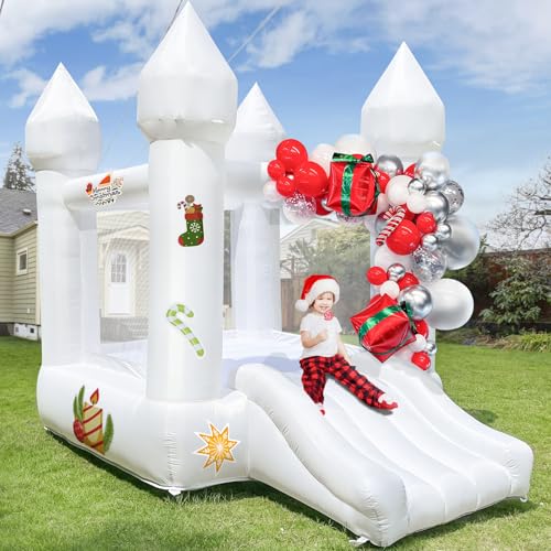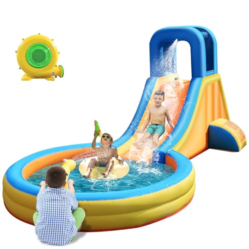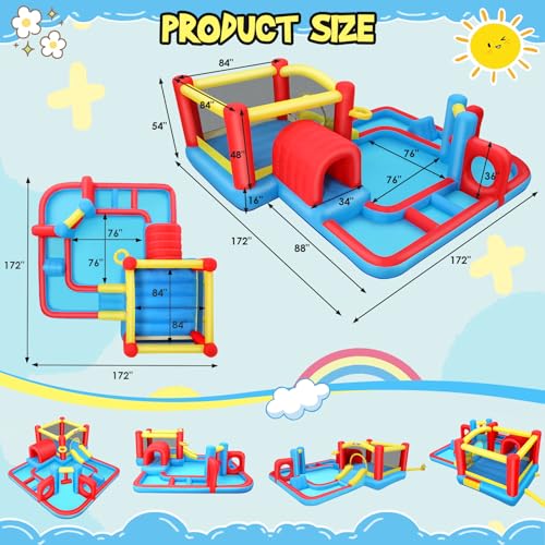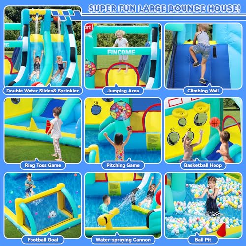 FINCOME Inflatable Water Slide Bounce House with 2 Slide for Kids Inflatable Waterslide Park with Splash Pool Basketball Hoop Ball Shooting & Water Cannon for Backyard Outdoor Indoor