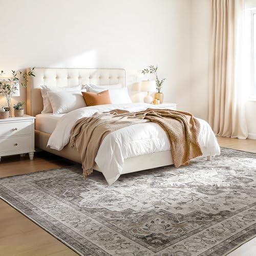 Marsail 8x10 Machine Washable Area Rug Soft & Slip-Resistant Large Area Rug with Reinforced Bound Edges Vintage Short-Pile Washable Rug with Floral Pattern for Living Room Dinning Room and Bedroom