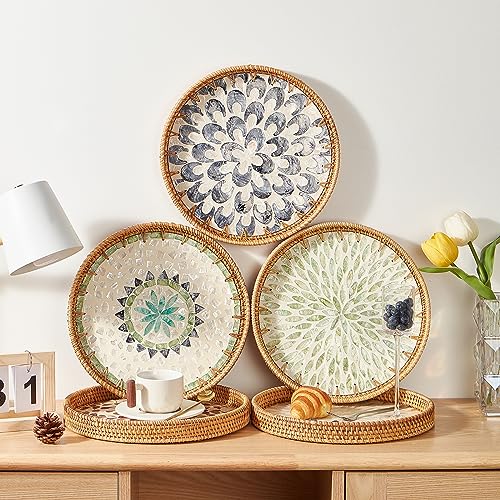Round Rattan Tray with Mother of Pearl Inlay Rattan Serving Tray with Wooden Base Decorative Wicker Basket for Table Decor Storage and Display of Coffee Bread Food Fruit (Checkerboard 11.8"")