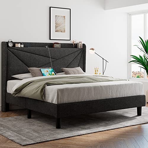 Feonase King Size Bed Frame with Luxury Wingback and Fast Charging Station Upholstered Button Tufted Storage Headboard King Platform Bed Wooden Slats Support Noise-Free Easy Assembly Matte Black