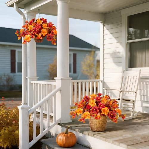 16 Bundles Artificial Mums Fall Flowers for Outdoors Faux Fake Mums for Outdoor Planters Autumn Decorations UV Resistant Silk Flowers for Front Porch Patio Home Decor (16 Orange)