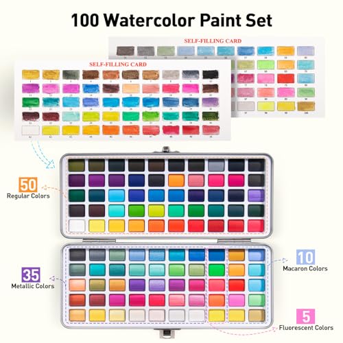 Watercolor Paint Set 100 Colors botkc Travel Water Colors kit with 7 Brushes 8 Watercolor papers Palette set Including Metallic and Accessories Art Supplies Gifts for Kids Artists Teens Adults and Hobbyists