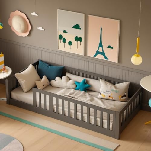 PVWIIK Twin Floor Bed w/Fence for Kids Girls Boys Floor Bed ...
