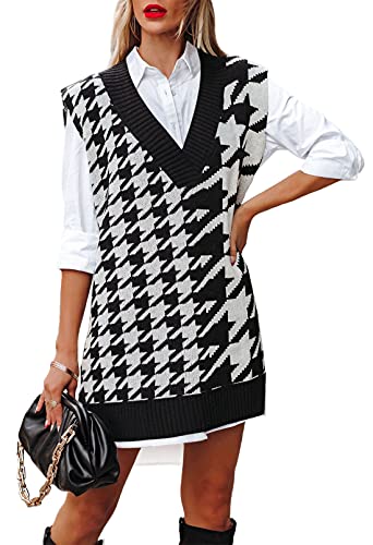Viottiset Women's Oversized Houndstooth Sweater Vest V Neck ...
