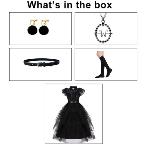 Features: 1. Unique Design: Inspired by classic characters the black costume blends elegance and mystery with its lapel buttons two-layer flounces elastic waistband and layered skirt. 2. Comfortable Fabric: Crafted from breathable skin-friendly fabric our black dress up clothes ensure kids stays cool and carefree during long hours of play. 3. Character-Specific Accessories: The Halloween dress set also includes black nail stickers double braid wig stockings and adjustable belt helping to create a more authentic character image. 4. Exquisite Jewelry Set: The matching jewelry set is made of high-quality plastic and set with sturdy sparkling and black-themed gemstones. 5. Versatile Outfit: Our Halloween costume is suitable for Halloween Birthday or themed parties cosplay events daily imaginative play performances and school activities. 6. Various Sizes: Designed for girls aged 4-10 our Halloween dress up clothes allow you to choo