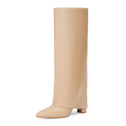 Modatope Knee High Nude Boots for Women Nude Fold Over Knee High Boots Chunky Heel Pointed Toe Long Boots Zipper Tall Nude Shark Boots Size 8.5