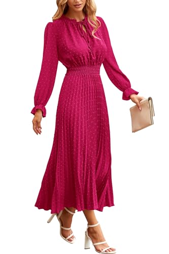 PRETTYGARDEN Women Swiss Dot Midi Dress Long Sleece Tie V Neck Pleated Long Flowy Dresses (Rose Red Small)