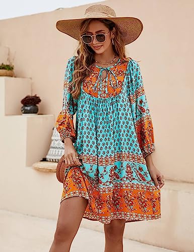 Bluetime Women Short Loose Floral Printed Mini Dress Beach Casual V Neck 3/4 Sleeve Cover up Dresses (L Neo Mint)
