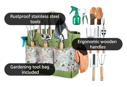 Grenebo Garden Tool Set 9 Pieces Garden Tool with Garden Tools Organiser Handbag Sturdy Garden Tools Set Ideal Garden Gifts for Women for Garden Lovers