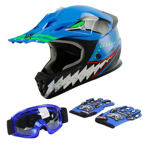 TCT-MOTORPARTS DOT Youth Kids Motocross ATV Helmets Offroad Street Dirt Bike Go-Kart BMX MX Full Face Helmet Blue w/Shark Mouth Medium Size