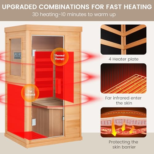 BNEHS Infrared Sauna 1 Person Full Spectrum Infrared Sauna for Home Indoor Dry Sauna with 4 Heater Panels Bluetooth and Tempered Glass Canadian Hemlock